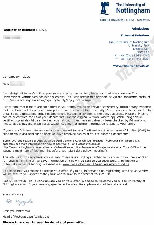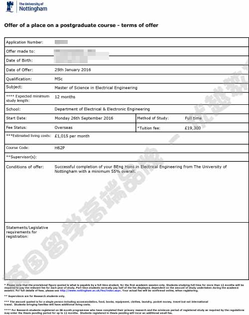 恭喜叶同学获得诺丁汉大学电子工程学专业硕士通知书。诺丁汉大学(The University of Nottingham),建于1881年,是全球百强名校,英国常春藤联盟罗素大学集团成员,M5大学联盟创始成员之一。诺丁汉在各类全球大学综合排名上常居全球前100,是入学竞争激烈的英国大学之一。根据2011年UCAS报告,该校与剑桥大学并列英国第3培养出多位知名CEO的学校,2014年TIMES英国大学工程学专业排名全英第二位