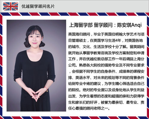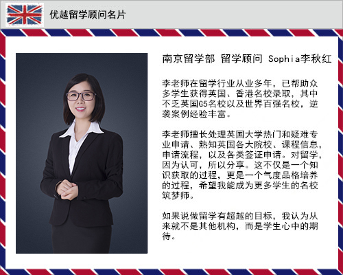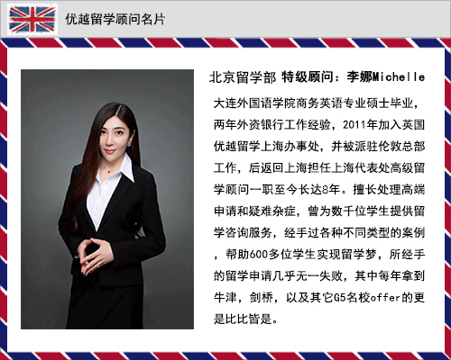 优越教育国际有限公司(优越留学)上海,北京与南京分公司的顾问老师,都是业内有名的,具备丰富专业知识与实战经验的申请能手。她们平均每人拥有超过400个成功案例,可以不无夸张地说,我们的顾问老师最突出的优势,是具备其他留学咨询机构所没有的方案定位能力,申请问题分析能力,以及高效的文书处理能力。下面为大家介绍一下来自优越留学上海、北京、南京地区的部分顾问:
