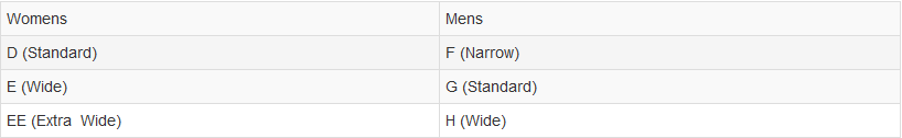 除了鞋的长度,宽度也是影响鞋子舒适度很主要的因素。还是拿Clarks的鞋子来说吧,他家就把宽度分红以下几个类型:
