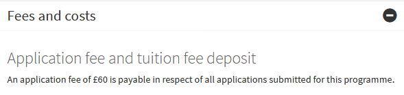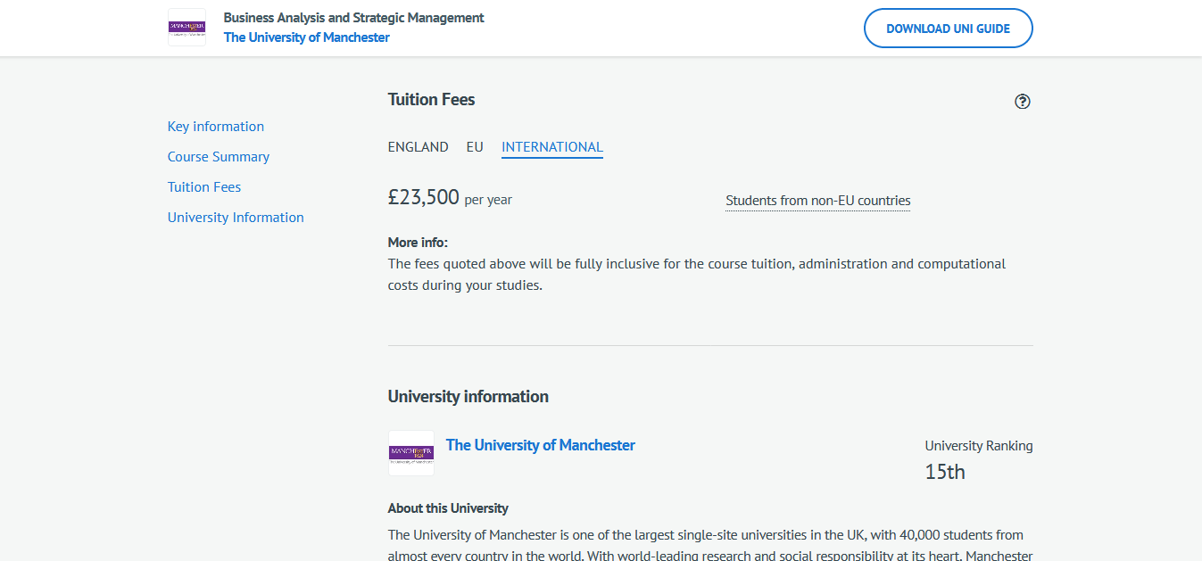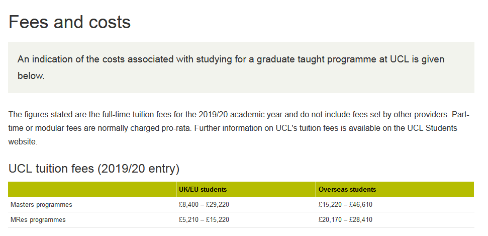 学费:英国硕士课程时长为1年,除部分商科、传媒和医学类较高以外,一般平均每年学费在£12000-£24000之间(伦敦地区/世界排名靠前的院校学费一般来说都相对更高一些),工商管理硕士MBA一般在£35000-£44000之间。(重点关心这部分的建议直接往后拉,教你如何查询具体课程的准确学费金额)