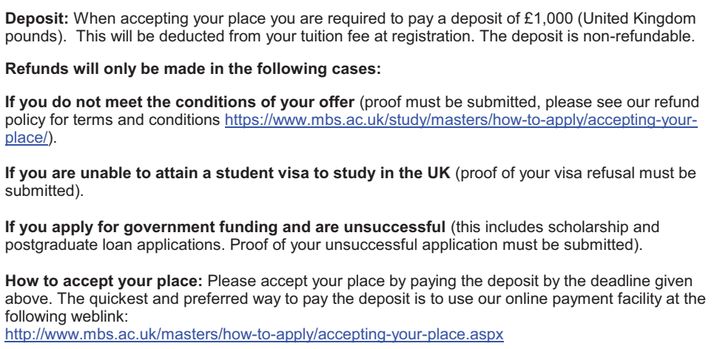 在获得学校offer后,需在收到offer的一定时间内(通常是28天)缴纳一笔offer押金,也有同学称之为留位费,一般在1000-2000英镑左右(可以视作提前交部分学费),具体金额和提交时间大家可以查看offer中deposit部分说明,按照规定的时间缴纳规定的金额即可。无特殊情况,留位费是不会退还给学生的。