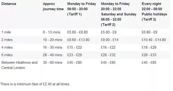 周末的中小型轿车租费在£70-80;出租车收费请看下图,起步价最低有£2.40,15分钟车程至少10镑。